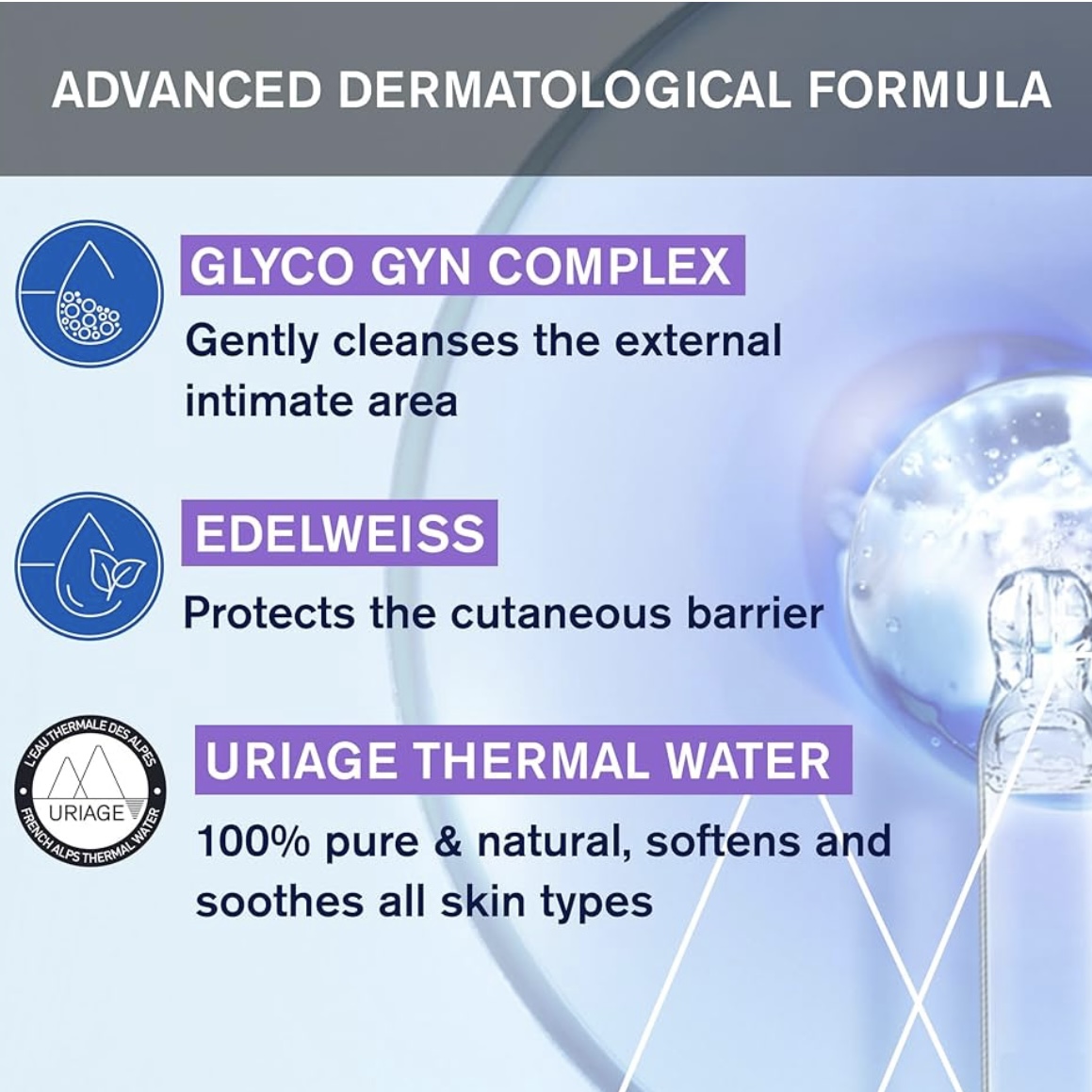 ▪️ حاوی آب معدنی اوریاژ، اسید لاکتیک و کمپلکس GLYCO-GYN است که به حفظ رطوبت، تسکین پوست و تعادل فلور طبیعی کمک می‌کنند.